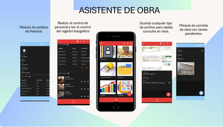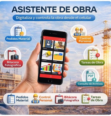 Asistente de Obra es una aplicación móvil diseñada para centralizar y simplificar el control de obra en un solo lugar. Desde el celular, el equipo puede gestionar pedidos de material, control de personal, registro fotográfico, consulta de documentos y el seguimiento de tareas del comité de obra, evitando pérdidas de información, WhatsApps eternos y “¿quién tiene la última versión?” (ese clásico de la construcción).