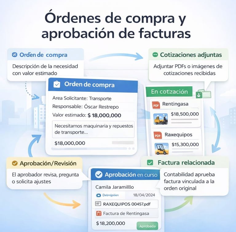 Factura vinculada: cuando llega la factura, se relaciona con la orden de compra original, quedando todo el histórico disponible en una sola vista: necesidad → cotizaciones → decisiones → factura.